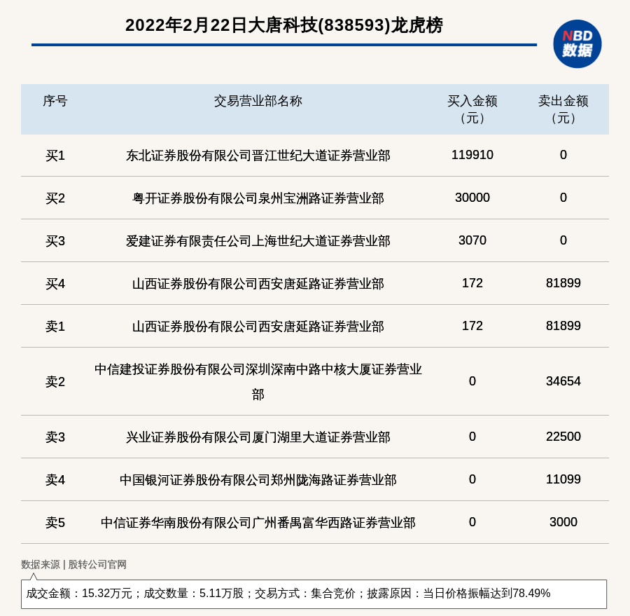 每經(jīng)訊,2022年2月22日,新三板創(chuàng)新層公司大唐科技(838593)登上龍虎榜,交易方式是集合競價,披露原因是當(dāng)日價格振幅達(dá)到78.49%,成交數(shù)量5.11萬股,成交金額15.32萬元。買一席位為東北證券股份有限公司晉江世紀(jì)大道證券營業(yè)部,買入11.99萬元;賣一席位為山西證券股份有限公司西安唐延路證券營業(yè)部,賣出8.19萬元。