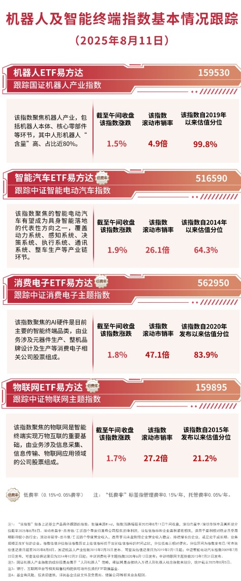 截至午間收盤,中證智能電動汽車指數(shù)上漲1.9%,中證消費電子主題指數(shù)上漲1.8%,中證物聯(lián)網(wǎng)主題指數(shù)上漲1.7%,國證機器人產(chǎn)業(yè)指數(shù)上漲1.5%,相關(guān)產(chǎn)品獲資金關(guān)注,機器人ETF易方達(dá)(159530)半日凈申購達(dá)6700萬份。