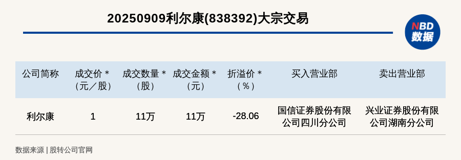 每經(jīng)訊,2025年9月9日,新三板基礎(chǔ)層公司利爾康(838392,收盤價:1.39元)發(fā)生一筆大宗交易,成交價1元/股,成交數(shù)量11萬股,成交金額11萬元,折價28.06%。買入營業(yè)部是國信證券股份有限公司四川分公司,賣出營業(yè)部是興業(yè)證券股份有限公司湖南分公司。