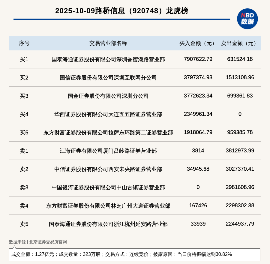 每經(jīng)訊,2025年10月9日,北交所上市公司路橋信息(920748,收盤價:38.01元)登上龍虎榜,交易方式是連續(xù)競價,披露原因是當(dāng)日價格振幅達到30.82%,成交數(shù)量323萬股,成交金額1.27億元。買一席位為國泰海通證券股份有限公司深圳香蜜湖路營業(yè)部,買入790.76萬元;賣一席位為江海證券有限公司廈門呂嶺路證券營業(yè)部,賣出381.3萬元。