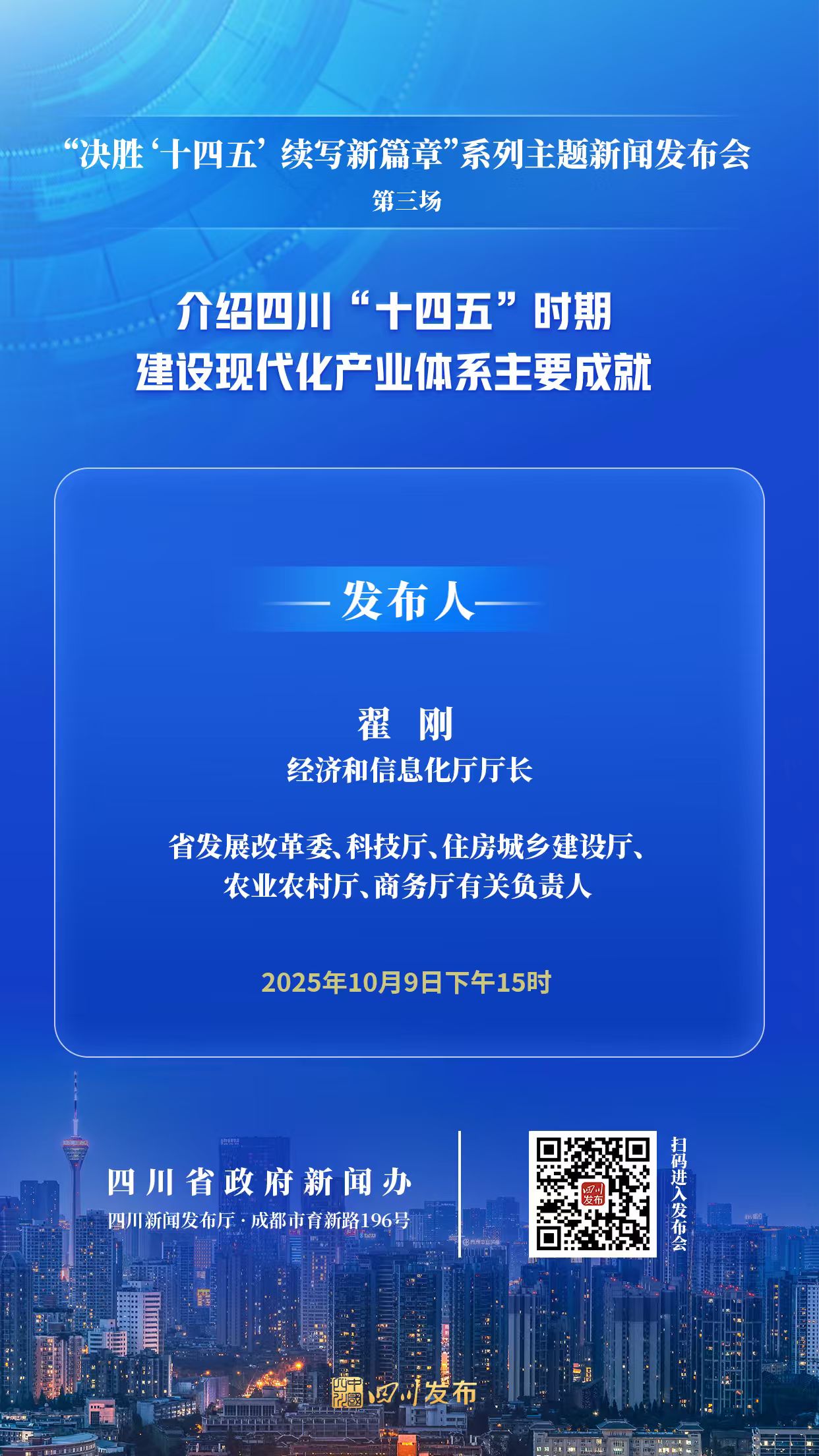 2025年10月9日(星期四)15:00,省政府新聞辦將在四川新聞發(fā)布廳舉行“決勝‘十四五’ 續(xù)寫新篇章”系列主題新聞發(fā)布會第三場,經(jīng)濟和信息化廳廳長翟剛圍繞四川“十四五”時期建設(shè)現(xiàn)代化產(chǎn)業(yè)體系主要成就作介紹并答記者問,省發(fā)展改革委、科技廳、住房城鄉(xiāng)建設(shè)廳、農(nóng)業(yè)農(nóng)村廳、商務(wù)廳有關(guān)負責人參加并答記者問。四川發(fā)布客戶端將全程圖文直播,敬請關(guān)注!
