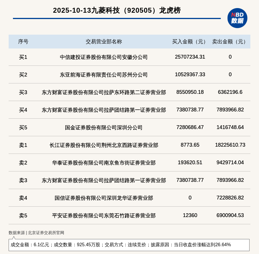 每經(jīng)訊,2025年10月13日,北交所上市公司九菱科技(920505,收盤價:70.16元)登上龍虎榜,交易方式是連續(xù)競價,披露原因是當日收盤價漲幅達到26.64%,成交數(shù)量925.45萬股,成交金額6.1億元。買一席位為中信建投證券股份有限公司安徽分公司,買入2570.72萬元;賣一席位為長江證券股份有限公司荊州北京西路證券營業(yè)部,賣出1822.56萬元。