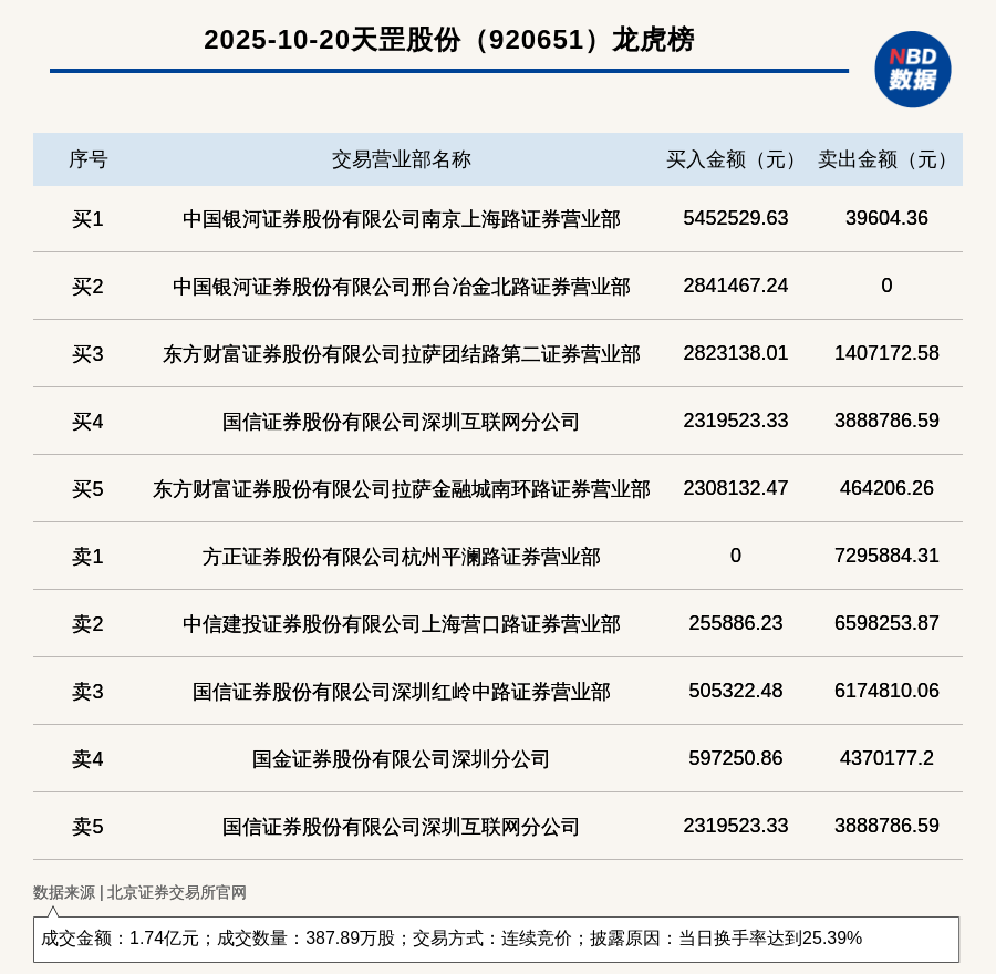 每經(jīng)訊,2025年10月20日,北交所上市公司天罡股份(920651,收盤價(jià):43.7元)登上龍虎榜,交易方式是連續(xù)競價(jià),披露原因是當(dāng)日換手率達(dá)到25.39%,成交數(shù)量387.89萬股,成交金額1.74億元。買一席位為中國銀河證券股份有限公司南京上海路證券營業(yè)部,買入545.25萬元;賣一席位為方正證券股份有限公司杭州平瀾路證券營業(yè)部,賣出729.59萬元。