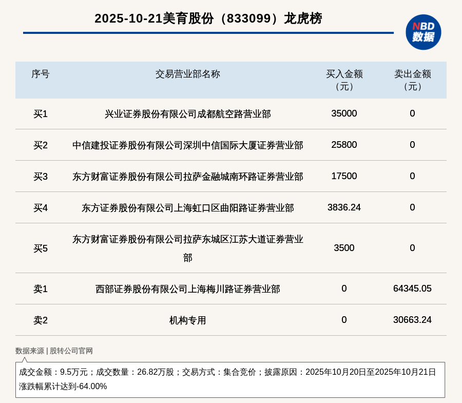 每經(jīng)訊,2025年10月21日,新三板創(chuàng)新層公司美育股份(833099,收盤價:0.36元)登上龍虎榜,交易方式是集合競價,披露原因是2025年10月20日至2025年10月21日漲跌幅累計達到-64.00%,成交數(shù)量26.82萬股,成交金額9.5萬元。買一席位為興業(yè)證券股份有限公司成都航空路營業(yè)部,買入3.5萬元;賣一席位為西部證券股份有限公司上海梅川路證券營業(yè)部,賣出6.43萬元。