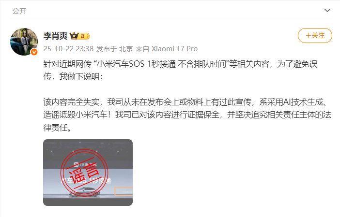 針對(duì)近期網(wǎng)傳 “小米汽車SOS 1秒接通 ,不含排隊(duì)時(shí)間”等相關(guān)內(nèi)容,小米汽車副總裁李肖爽發(fā)文稱,該內(nèi)容完全失實(shí),公司從未在發(fā)布會(huì)上或物料上有過此宣傳,系采用AI技術(shù)生成、造謠詆毀小米汽車。公司已對(duì)該內(nèi)容進(jìn)行證據(jù)保全,并堅(jiān)決追究相關(guān)責(zé)任主體的法律責(zé)任。