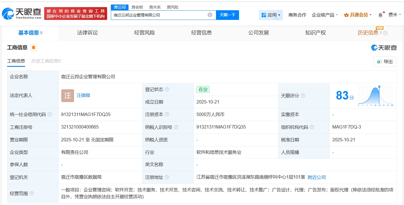 每經(jīng)AI快訊,天眼查App顯示,近日,宿遷云邦企業(yè)管理有限公司成立,法定代表人為汪微微,注冊資本5000萬元人民幣,經(jīng)營范圍包括企業(yè)管理咨詢、軟件開發(fā)、廣告發(fā)布等,由京東旗下宿遷涵邦投資管理有限公司全資持股。