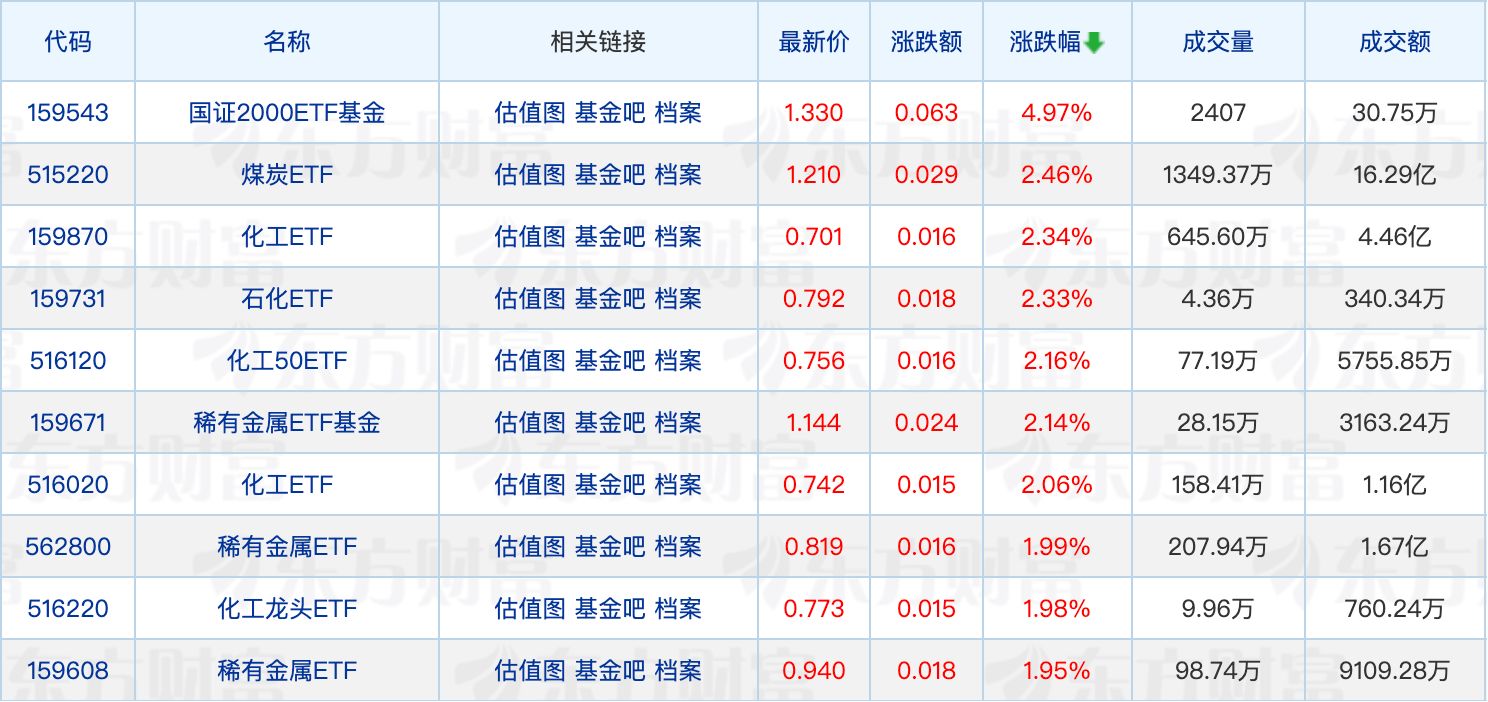 具體來(lái)看,國(guó)證2000ETF基金領(lǐng)漲4.97%,煤炭ETF、化工相關(guān)ETF也有所表現(xiàn)。