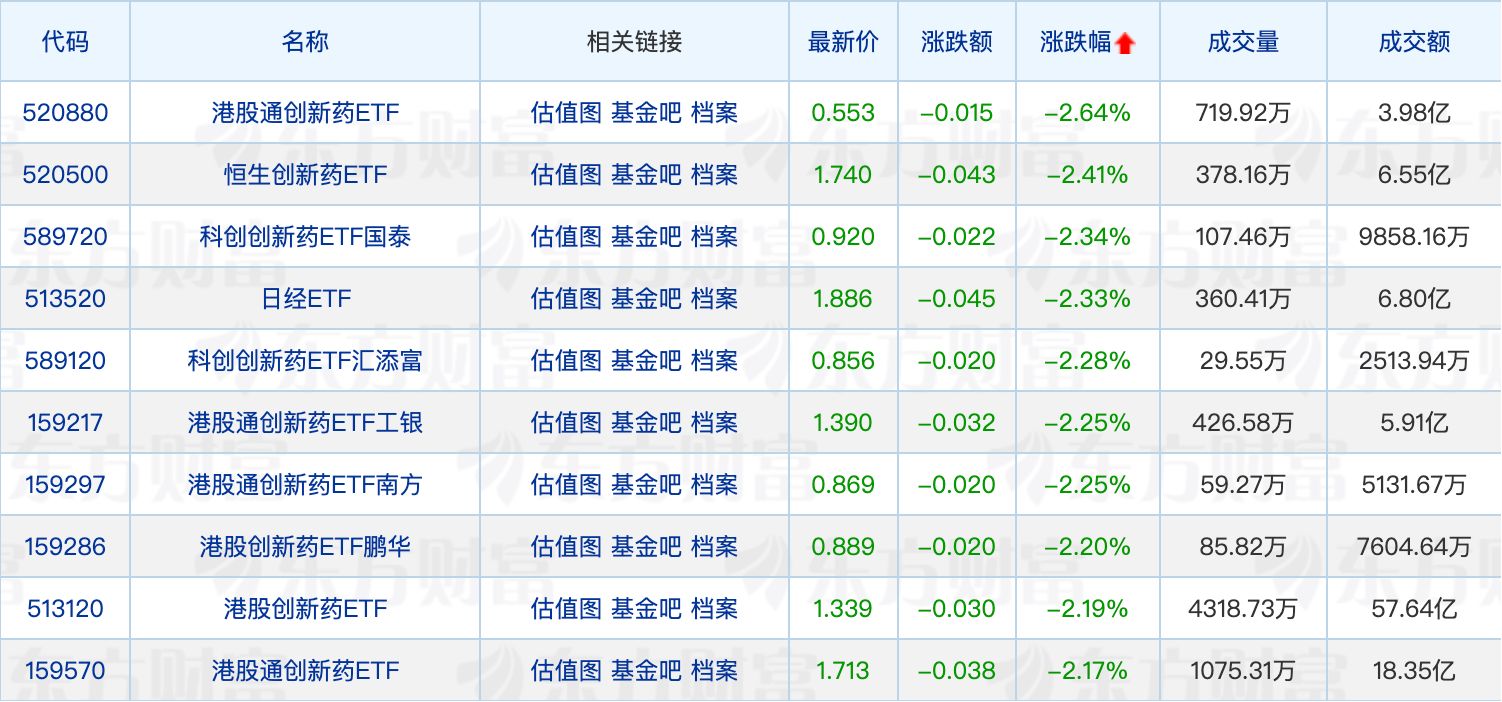 下跌方面,港股創(chuàng)新藥相關(guān)ETF集體回調(diào),最高下跌2.64%。