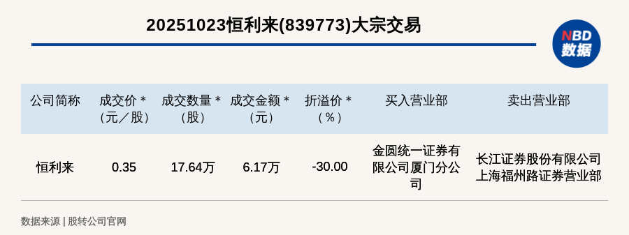 每經(jīng)訊,2025年10月23日,新三板基礎(chǔ)層公司恒利來(839773,收盤價(jià):0.5元)發(fā)生一筆大宗交易,成交價(jià)0.35元/股,成交數(shù)量17.64萬股,成交金額6.17萬元,折價(jià)30%。買入營(yíng)業(yè)部是金圓統(tǒng)一證券有限公司廈門分公司,賣出營(yíng)業(yè)部是長(zhǎng)江證券股份有限公司上海福州路證券營(yíng)業(yè)部。