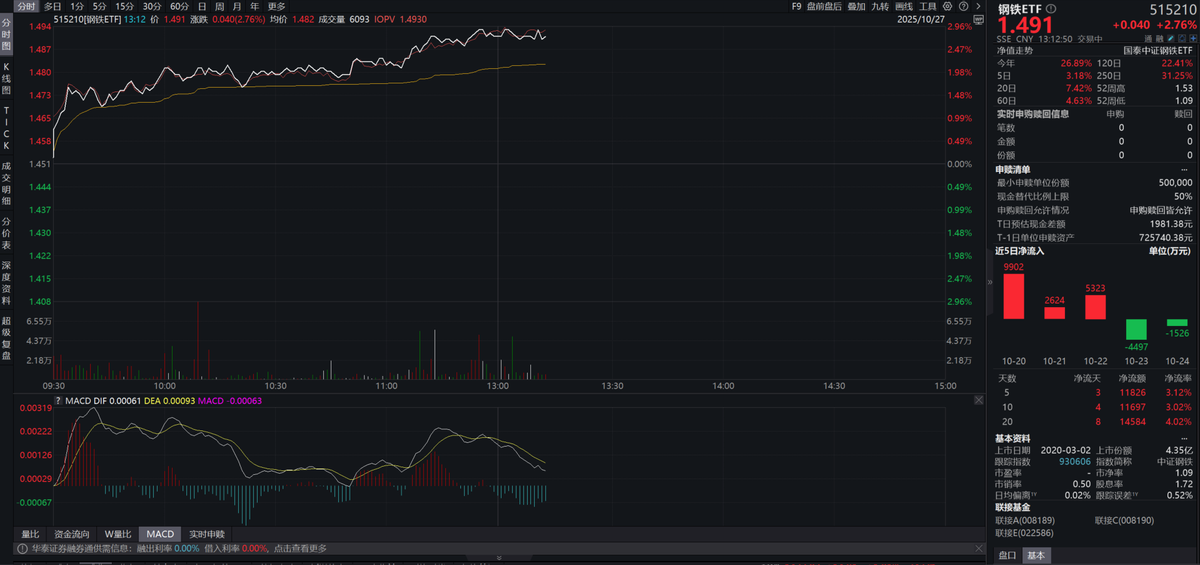 10月27日午盤,鋼鐵產(chǎn)業(yè)放量大漲,全市場唯一鋼鐵ETF(515210)漲幅超2%,資金搶籌布局,近5日凈流入超1億元。
