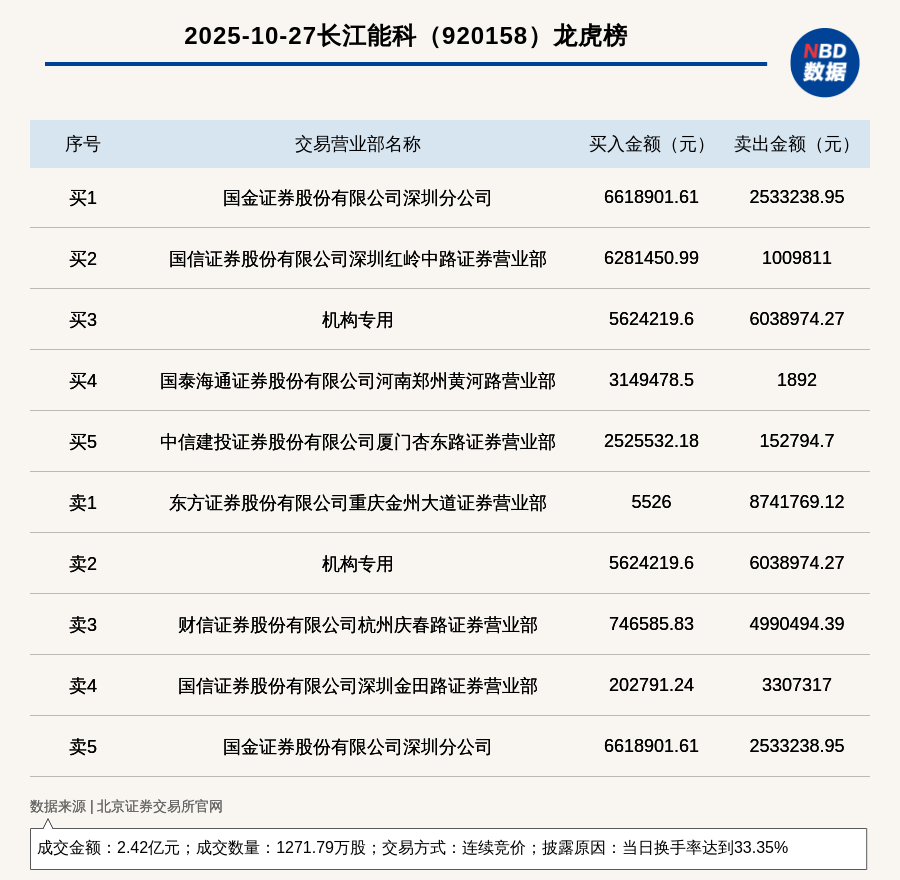 每經(jīng)訊,2025年10月27日,北交所上市公司長江能科(920158,收盤價:19.93元)登上龍虎榜,交易方式是連續(xù)競價,披露原因是當(dāng)日換手率達(dá)到33.35%,成交數(shù)量1271.79萬股,成交金額2.42億元。買一席位為國金證券股份有限公司深圳分公司,買入661.89萬元;賣一席位為東方證券股份有限公司重慶金州大道證券營業(yè)部,賣出874.18萬元。