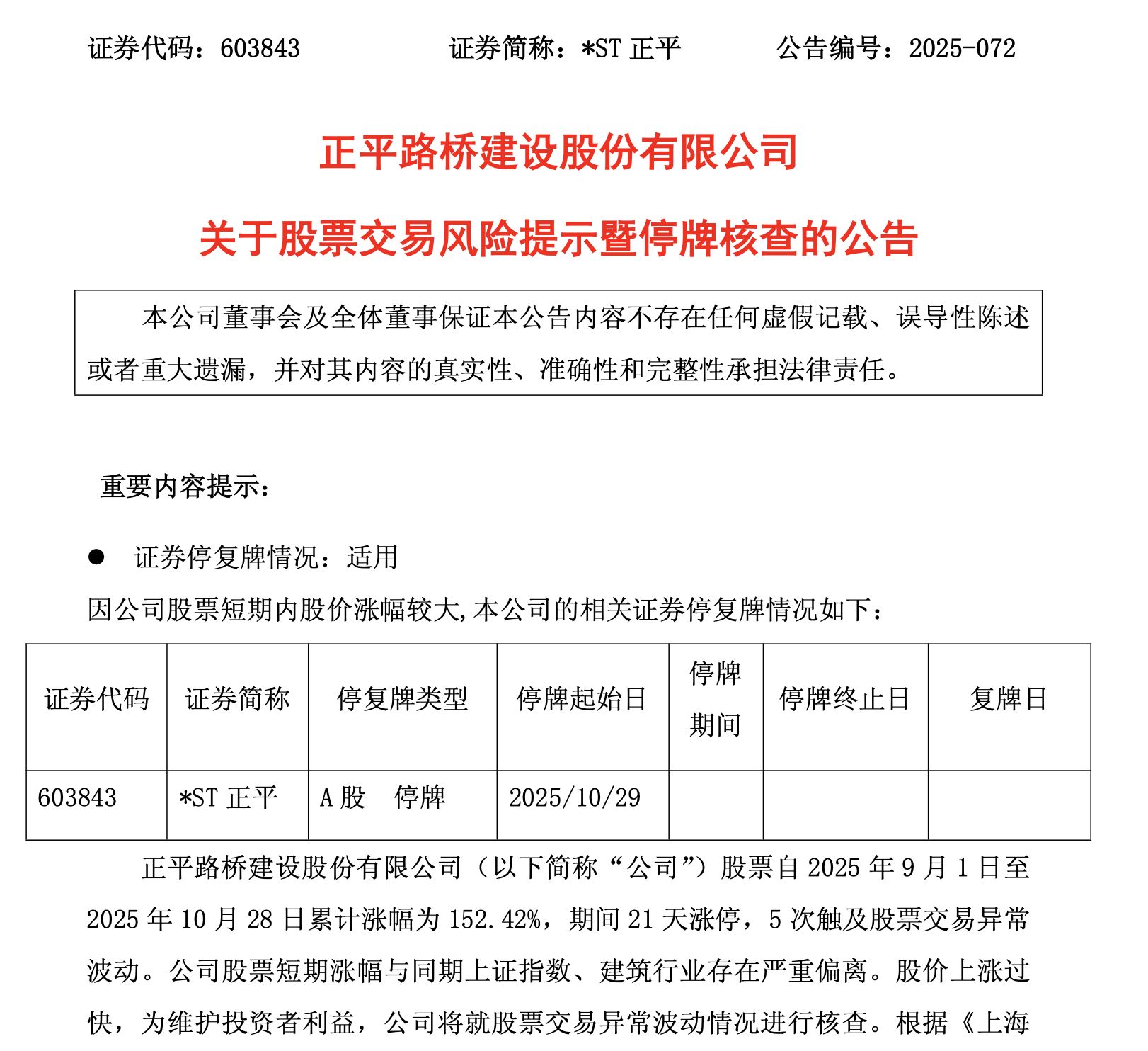 10月28日晚,*ST正平(603843.SH)公告稱,公司股票自2025年9月1日至10月28日累計(jì)漲幅為152.42%,期間多次觸及股票交易異常波動(dòng)。公司股價(jià)短期漲幅與同期上證指數(shù)、建筑行業(yè)存在嚴(yán)重偏離,可能存在市場情緒過熱和非理性炒作情形。公司將自10月29日起停牌核查,預(yù)計(jì)停牌時(shí)間不超過10個(gè)交易日。此外,公司2024年年報(bào)被出具無法表示意見的審計(jì)報(bào)告,存在終止上市風(fēng)險(xiǎn);礦產(chǎn)資源開采能力不足,后續(xù)開發(fā)進(jìn)展和收益存在重大不確定性;非經(jīng)營性資金占用尚未解決;業(yè)績持續(xù)虧損。