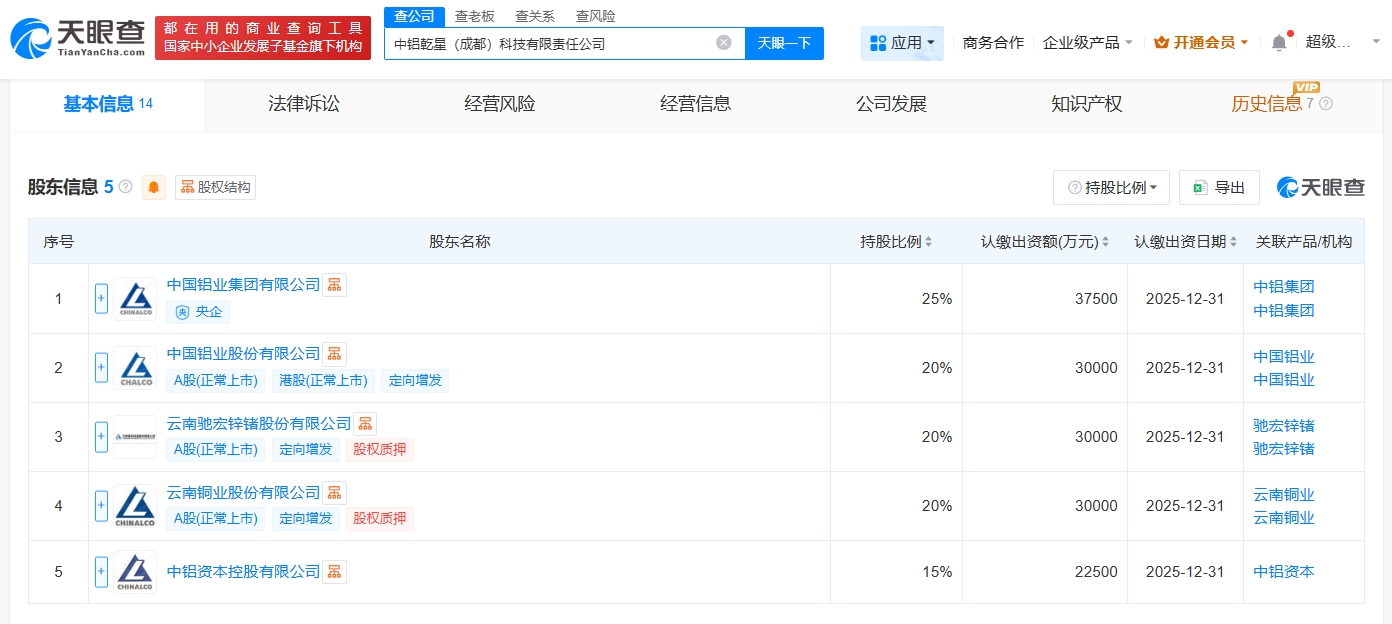 每經(jīng)AI快訊,天眼查App顯示,近日,中鋁乾星(成都)科技有限責任公司成立,法定代表人為楊秀亮,注冊資本15億元,經(jīng)營范圍包括新材料技術研發(fā)、電子專用材料研發(fā)、電子專用材料制造等。股東信息顯示,該公司由中國鋁業(yè)集團有限公司、馳宏鋅鍺、云南銅業(yè)等共同持股。