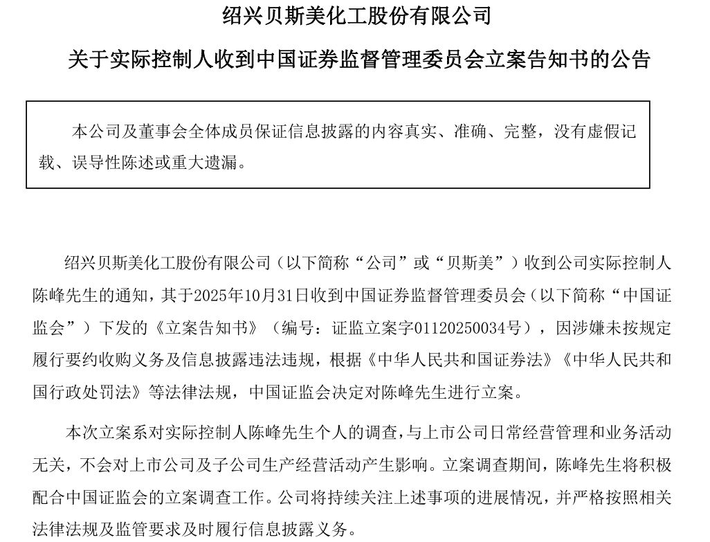 10月31日,貝斯美(300796.SZ,股價9.98元,市值36.04億元)公告稱,公司實際控制人陳峰于2025年10月31日收到中國證監(jiān)會下發(fā)的《立案告知書》,因涉嫌未按規(guī)定履行要約收購義務(wù)及信息披露違法違規(guī),中國證監(jiān)會決定對陳峰進行立案。本次立案系對陳峰個人的調(diào)查,與上市公司日常經(jīng)營管理和業(yè)務(wù)活動無關(guān),不會對上市公司及子公司生產(chǎn)經(jīng)營活動產(chǎn)生影響。