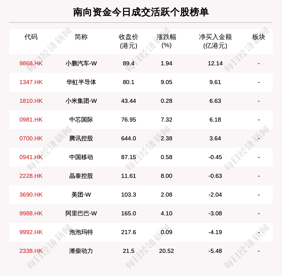 南向資金成交活躍個(gè)股榜單中,凈買(mǎi)入個(gè)股共5只,金額最多的是小鵬汽車(chē)-W(9868.HK,收盤(pán)價(jià):89.4港元),凈買(mǎi)入12.136億港元;凈賣(mài)出個(gè)股共6只,金額最多的是濰柴動(dòng)力(2338.HK,收盤(pán)價(jià):21.5港元),凈賣(mài)出5.481億港元。