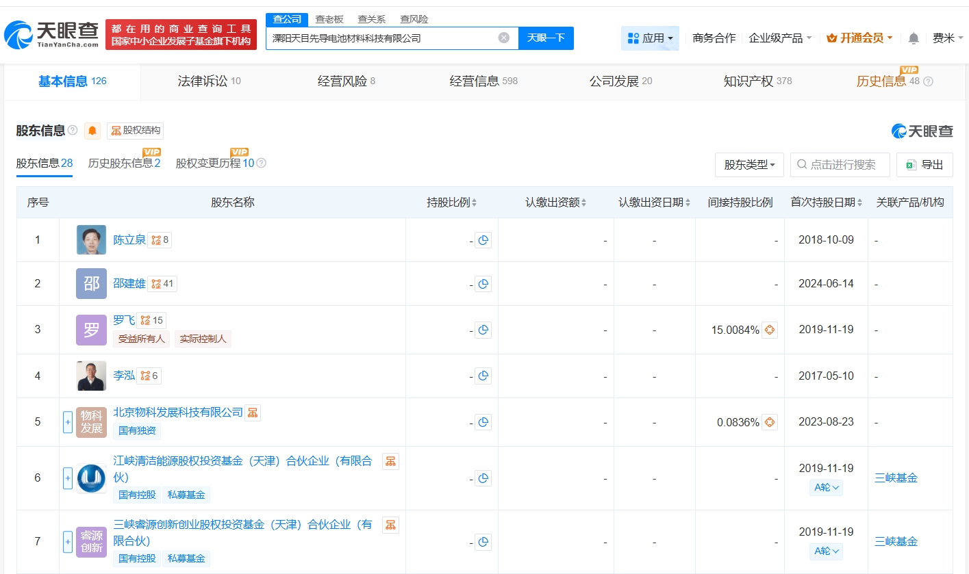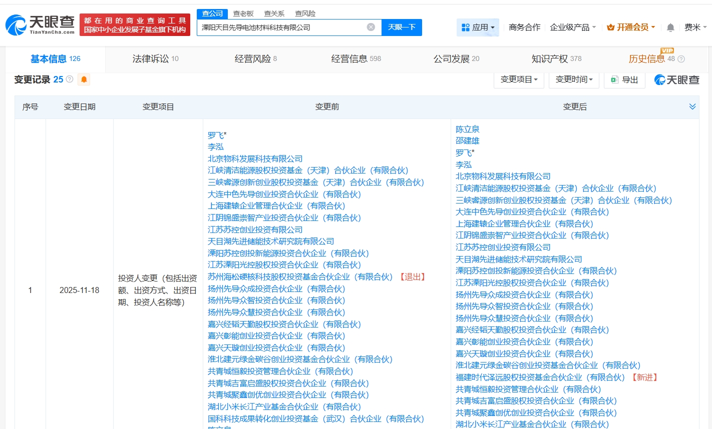 每經(jīng)AI快訊,天眼查工商信息顯示,近日,溧陽(yáng)天目先導(dǎo)電池材料科技有限公司發(fā)生工商變更,原股東蘇州海松硬核科技股權(quán)投資基金合伙企業(yè)(有限合伙)退出,新增寧德時(shí)代參投的福建時(shí)代澤遠(yuǎn)股權(quán)投資基金合伙企業(yè)(有限合伙)、深圳市綠水長(zhǎng)青創(chuàng)業(yè)投資合伙企業(yè)(有限合伙)為股東。溧陽(yáng)天目先導(dǎo)電池材料科技有限公司成立于2017年5月,注冊(cè)資本約9.5億元人民幣,法定代表人為羅飛,經(jīng)營(yíng)范圍包括鋰電池負(fù)極材料的技術(shù)開(kāi)發(fā)、技術(shù)轉(zhuǎn)讓、技術(shù)服務(wù)、技術(shù)咨詢、生產(chǎn)、加工和銷售等。股東信息顯示,該公司現(xiàn)由陳立泉、邵建雄及上述新增股東等共同持股。