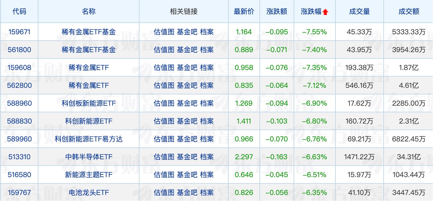 具體來看,稀有金屬ETF集體回調(diào),多只產(chǎn)品跌幅超過7%。此外,科創(chuàng)板新能源相關(guān)ETF也悉數(shù)回調(diào)。