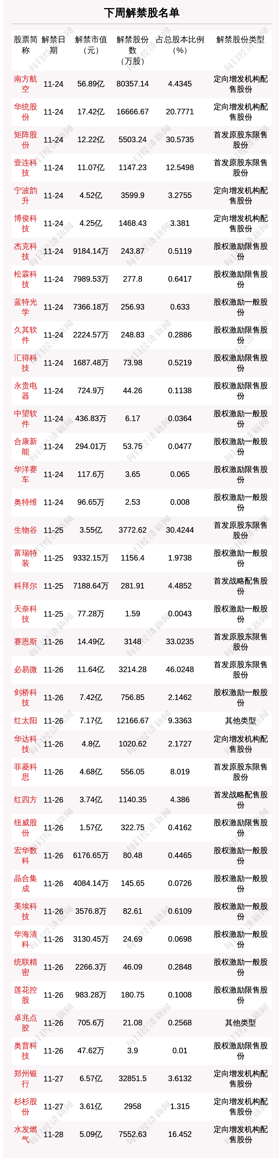 具體到個(gè)股,下周解禁市值排名前3的是南方航空、華統(tǒng)股份、賽恩斯,解禁市值分別為56.89億元、17.42億元、14.49億元。