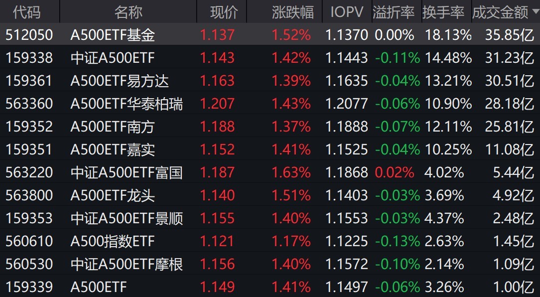 截至上午收盤,場內(nèi)跟蹤中證A500指數(shù)的ETF漲超1%。其中,有12只中證A500相關(guān)ETF成交額超1億元,3只超30億元。A500ETF基金、中證A500ETF、A500ETF易方達早盤成交額分別為35.85億元、31.23億元、30.51億元。