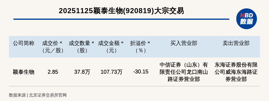 每經(jīng)訊,2025年11月25日,北交所上市公司穎泰生物(920819,收盤價:4.08元)發(fā)生一筆大宗交易,成交價2.85元/股,成交數(shù)量37.8萬股,成交金額107.73萬元,折價30.15%。買入營業(yè)部是中信證券(山東)有限責(zé)任公司龍口南山路證券營業(yè)部,賣出營業(yè)部是東海證券股份有限公司威海東海路證券營業(yè)部。