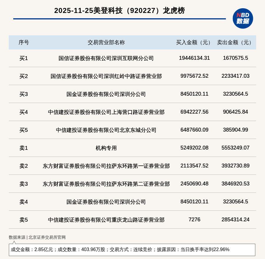 每經(jīng)訊,2025年11月25日,北交所上市公司美登科技(920227,收盤價(jià):68.48元)登上龍虎榜,交易方式是連續(xù)競(jìng)價(jià),披露原因是當(dāng)日換手率達(dá)到22.96%,成交數(shù)量403.96萬股,成交金額2.85億元。買一席位為國信證券股份有限公司深圳互聯(lián)網(wǎng)分公司,買入1944.61萬元;賣一席位為機(jī)構(gòu)專用,賣出555.32萬元。