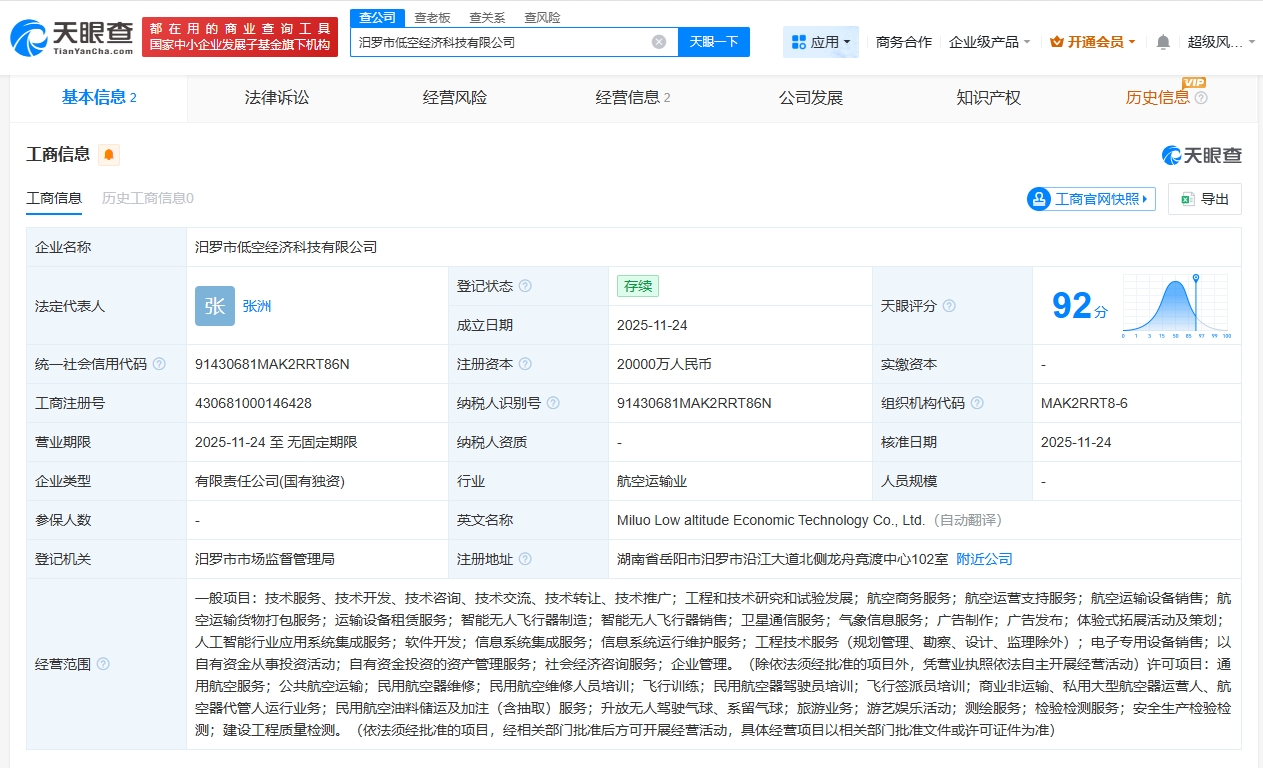 每經(jīng)AI快訊,天眼查App顯示,近日,汨羅市低空經(jīng)濟科技有限公司成立,法定代表人為張洲,注冊資本2億元人民幣,經(jīng)營范圍包括工程和技術(shù)研究和試驗發(fā)展、航空運營支持服務、智能無人飛行器制造、智能無人飛行器銷售等。股東信息顯示,該公司由汨羅市國有資產(chǎn)服務中心全資持股。