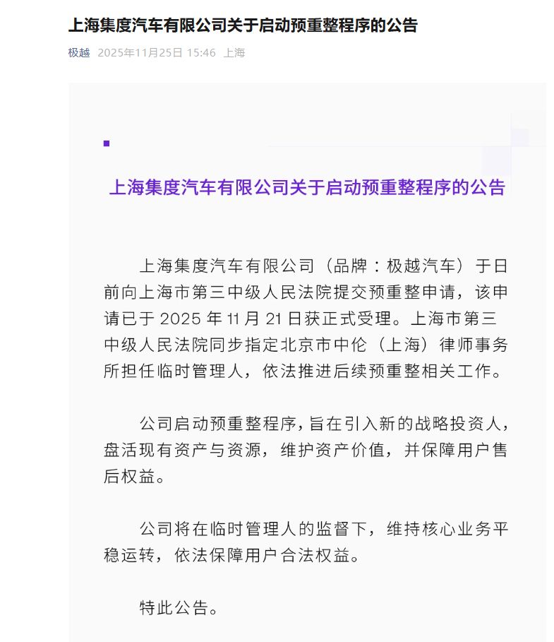 據(jù)悉,上海集度汽車有限公司日前向上海市第三中級人民法院提交預(yù)重整申請,該申請已于2025年11月21日獲正式受理。上海市第三中級人民法院同步指定北京市中倫(上海)律師事務(wù)所擔(dān)任臨時(shí)管理人,依法推進(jìn)后續(xù)預(yù)重整相關(guān)工作。