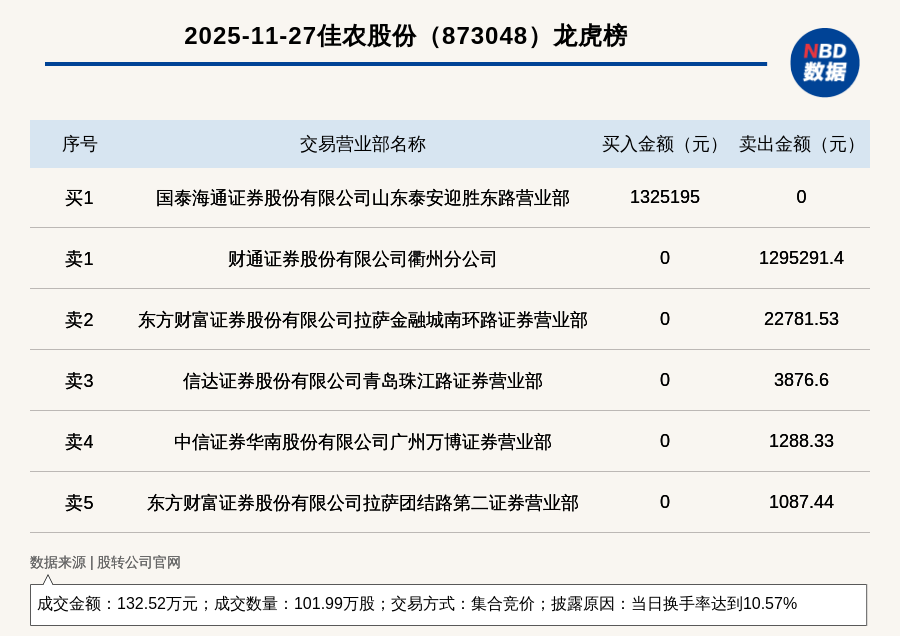 每經(jīng)訊,2025年11月27日,新三板創(chuàng)新層公司佳農(nóng)股份(873048,收盤價(jià):1.3元)登上龍虎榜,交易方式是集合競(jìng)價(jià),披露原因是當(dāng)日換手率達(dá)到10.57%,成交數(shù)量101.99萬股,成交金額132.52萬元。買一席位為國(guó)泰海通證券股份有限公司山東泰安迎勝東路營(yíng)業(yè)部,買入132.52萬元;賣一席位為財(cái)通證券股份有限公司衢州分公司,賣出129.53萬元。