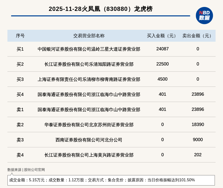 每經(jīng)訊,2025年11月28日,新三板創(chuàng)新層公司火鳳凰(830880,收盤價:8.08元)登上龍虎榜,交易方式是集合競價,披露原因是當日價格振幅達到101.50%,成交數(shù)量1.12萬股,成交金額5.15萬元。買一席位為中國銀河證券股份有限公司溫嶺三星大道證券營業(yè)部,買入2.41萬元;賣一席位為國泰海通證券股份有限公司浙江臨海巾山中路營業(yè)部,賣出2.39萬元。