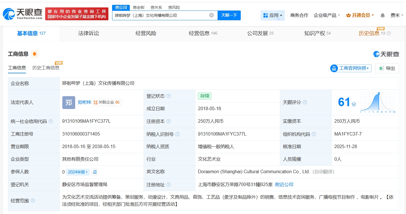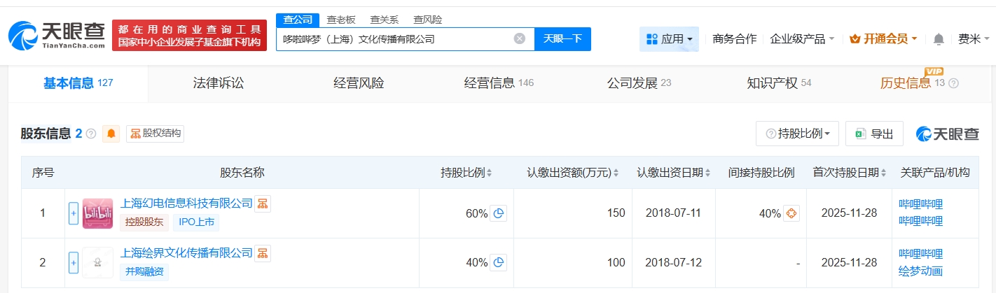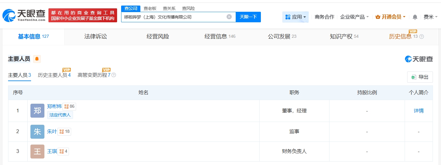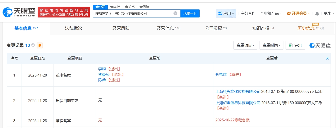 每經(jīng)AI快訊,天眼查工商信息顯示,近日,哆啦嗶夢(mèng)(上海)文化傳播有限公司發(fā)生工商變更,陳睿卸任董事長(zhǎng),同時(shí)多位高管發(fā)生變更。該公司成立于2018年5月,法定代表人為鄭彬煒,注冊(cè)資本250萬(wàn)元人民幣,經(jīng)營(yíng)范圍包括動(dòng)漫設(shè)計(jì)、信息技術(shù)咨詢服務(wù)、廣播電視節(jié)目制作等,由B站關(guān)聯(lián)公司上?;秒娦畔⒖萍加邢薰?、上海繪界文化傳播有限公司共同持股。值得一提的是,此前,陳睿已卸任上海寬娛數(shù)碼科技有限公司、幻電科技(上海)有限公司、上海嗶哩嗶哩科技有限公司的職務(wù)。