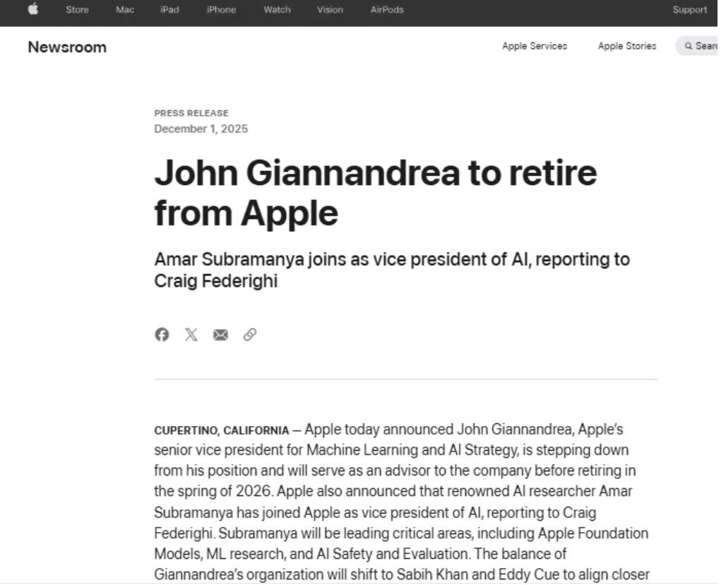 Giannandrea任期內(nèi),蘋果的AI團(tuán)隊(duì)被普遍認(rèn)為未能追趕上競爭對手,例如Apple Intelligence平臺表現(xiàn)不佳,新版Siri發(fā)布推遲。
