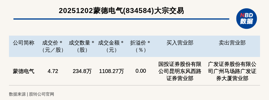 每經(jīng)訊,2025年12月2日,新三板基礎(chǔ)層公司蒙德電氣(834584,收盤價:4.72元)發(fā)生一筆大宗交易,成交價4.72元/股,成交數(shù)量234.8萬股,成交金額1108.27萬元,為平價交易。買入營業(yè)部是國投證券股份有限公司昆明東風(fēng)西路證券營業(yè)部,賣出營業(yè)部是廣發(fā)證券股份有限公司廣州馬場路廣發(fā)證券大廈營業(yè)部。