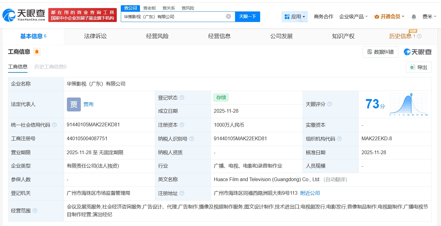 每經(jīng)AI快訊,天眼查工商信息顯示,近日,華策影視(廣東)有限公司成立,法定代表人為賈堯,注冊(cè)資本1000萬(wàn)元人民幣,經(jīng)營(yíng)范圍包括會(huì)議及展覽服務(wù)、社會(huì)經(jīng)濟(jì)咨詢(xún)服務(wù)、電視劇發(fā)行等。股東信息顯示,該公司由華策影視(300133)全資持股。