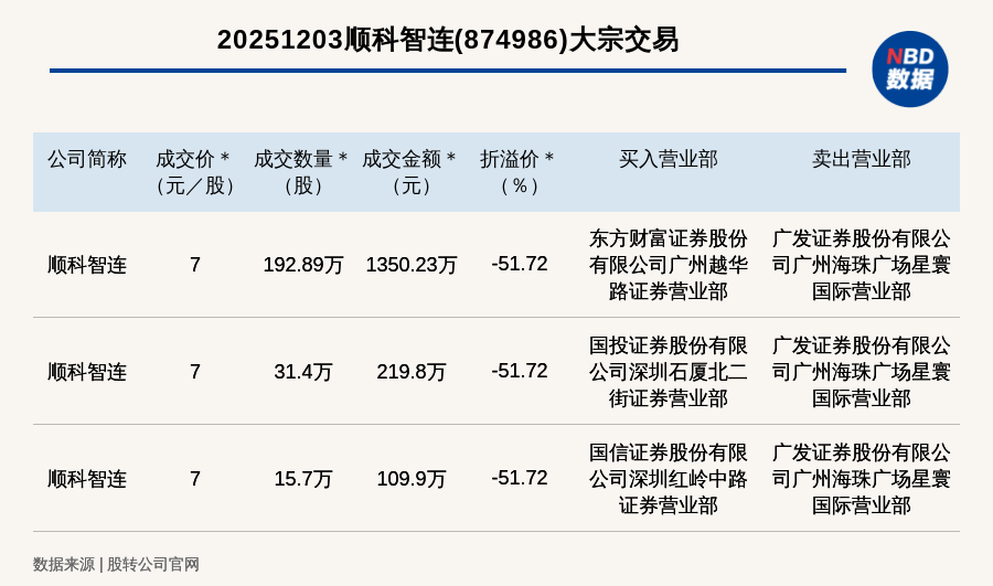每經(jīng)訊,2025年12月3日,新三板基礎(chǔ)層公司順科智連(874986,收盤價:14.5元)發(fā)生3筆大宗交易,總成交金額為1679.93萬元,成交金額最高的一筆成交價7元/股,成交數(shù)量192.89萬股,成交金額1350.23萬元,折價51.72%。買入營業(yè)部是東方財富證券股份有限公司廣州越華路證券營業(yè)部,賣出營業(yè)部是廣發(fā)證券股份有限公司廣州海珠廣場星寰國際營業(yè)部。