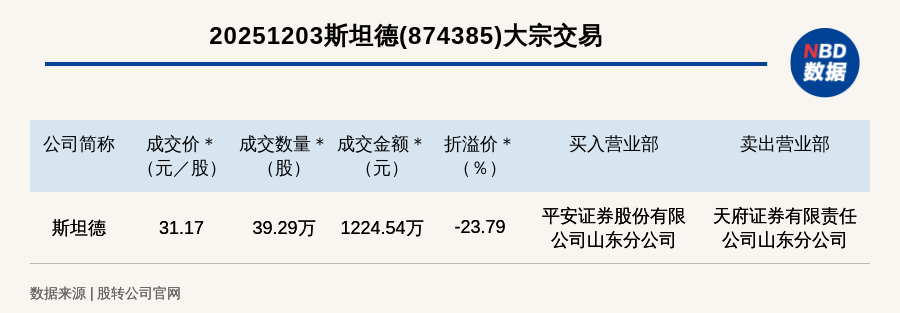每經(jīng)訊,2025年12月3日,新三板創(chuàng)新層公司斯坦德(874385,收盤價:40.9元)發(fā)生一筆大宗交易,成交價31.17元/股,成交數(shù)量39.29萬股,成交金額1224.54萬元,折價23.79%。買入營業(yè)部是平安證券股份有限公司山東分公司,賣出營業(yè)部是天府證券有限責(zé)任公司山東分公司。