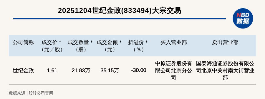 每經(jīng)訊,2025年12月4日,新三板基礎(chǔ)層公司世紀(jì)金政(833494,收盤價(jià):2.3元)發(fā)生一筆大宗交易,成交價(jià)1.61元/股,成交數(shù)量21.83萬(wàn)股,成交金額35.15萬(wàn)元,折價(jià)30%。買入營(yíng)業(yè)部是中原證券股份有限公司北京分公司,賣出營(yíng)業(yè)部是國(guó)泰海通證券股份有限公司北京中關(guān)村南大街營(yíng)業(yè)部。