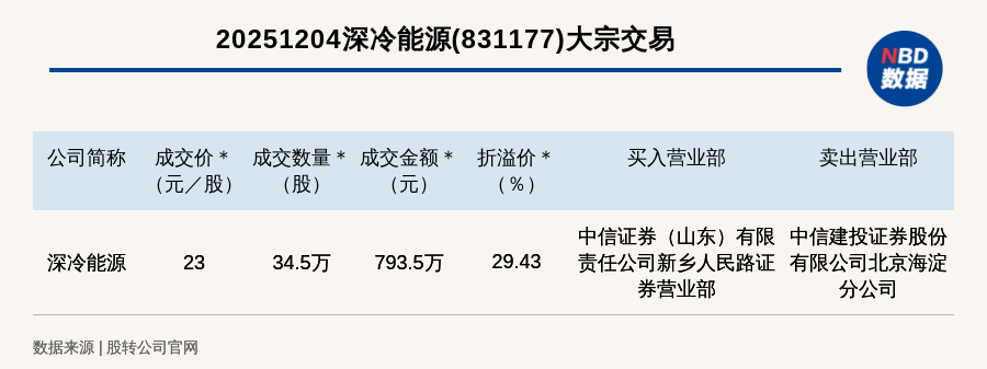 每經(jīng)訊,2025年12月4日,新三板創(chuàng)新層公司深冷能源(831177,收盤價:17.77元)發(fā)生一筆大宗交易,成交價23元/股,成交數(shù)量34.5萬股,成交金額793.5萬元,溢價29.43%。買入營業(yè)部是中信證券(山東)有限責任公司新鄉(xiāng)人民路證券營業(yè)部,賣出營業(yè)部是中信建投證券股份有限公司北京海淀分公司。