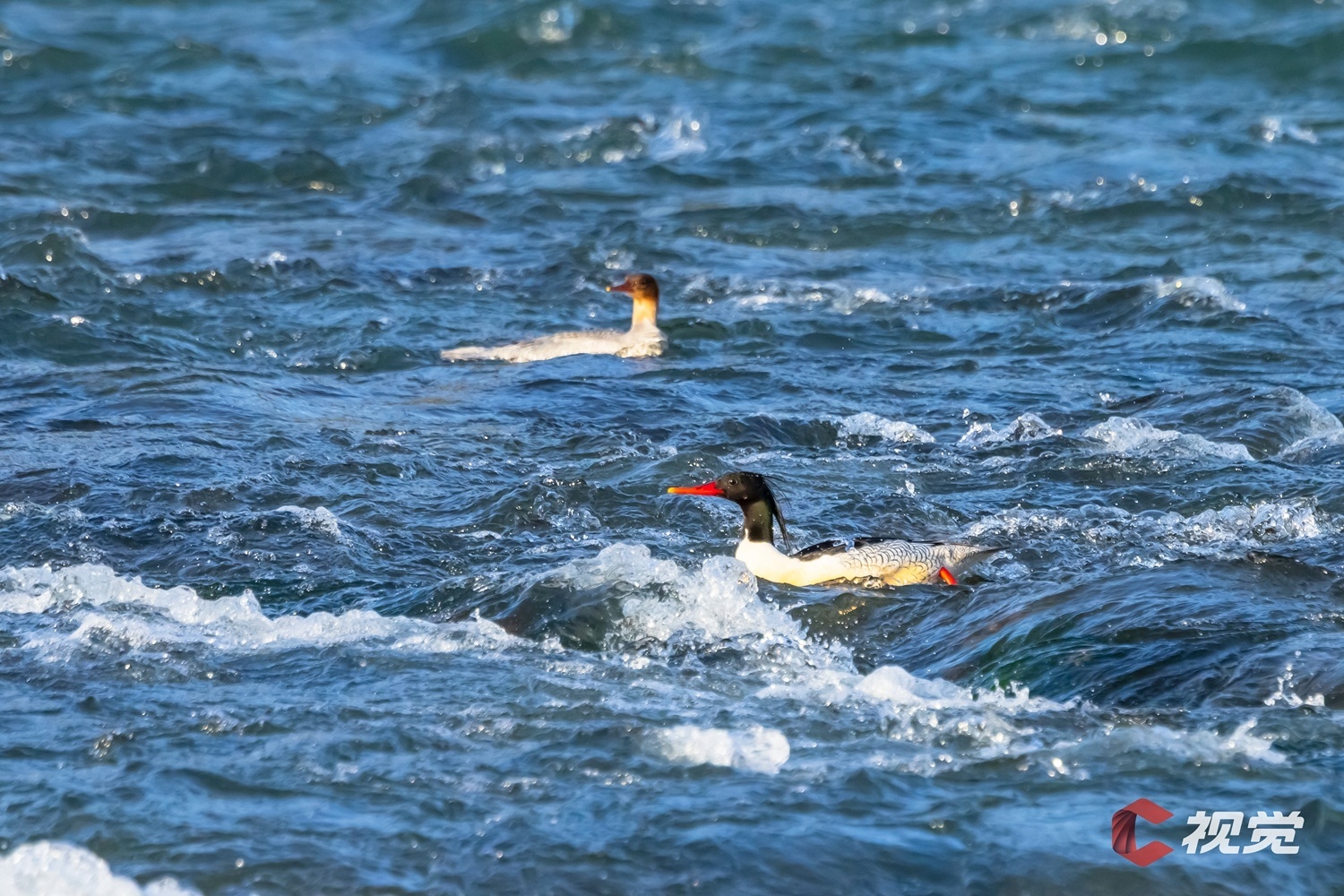 中華秋沙鴨在水中嬉戲、覓食。劉建強 攝