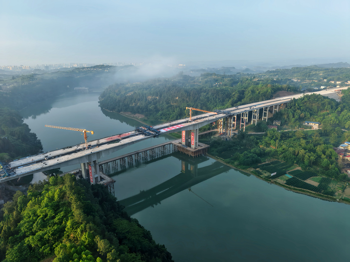 5月25日,銅資高速公路控制性工程——楊柳灘沱江特大橋主橋順利合龍,為2025年底銅資高速全線通車奠定了堅(jiān)實(shí)基礎(chǔ)。圖片由受訪者提供