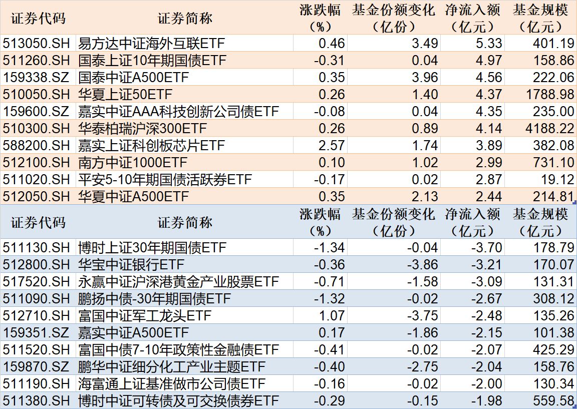 與此同時(shí),博時(shí)上證30年期國(guó)債ETF份額減少0.04億份,對(duì)應(yīng)凈流出3.7億元;華寶中證銀行ETF份額減少3.86億份,錄得凈流出3.21億元;永贏中證滬深港黃金產(chǎn)業(yè)股票ETF份額減少1.58億份,出現(xiàn)凈流出3.09億元。