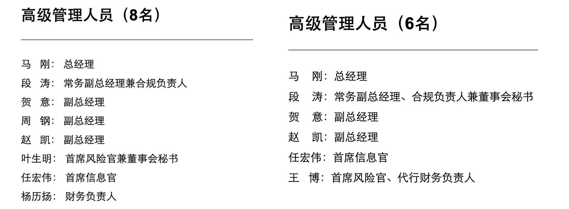 今年2月,華興證券曾經(jīng)歷了一次備受矚目的高層換屆。彼時,作為公司成立牽頭人的項威卸任,王力行接棒出任董事長,馬剛出任總經(jīng)理,公司搭建起“1名董事長+8名高級管理人員”的管理架構(gòu)。這8名高級管理人員分別是總經(jīng)理馬剛、常務副總經(jīng)理兼合規(guī)負責人段濤、副總經(jīng)理賀意、副總經(jīng)理周鋼、副總經(jīng)理趙凱、首席風險官兼董事會秘書葉生明、首席信息官任宏偉和財務負責人楊歷揚。