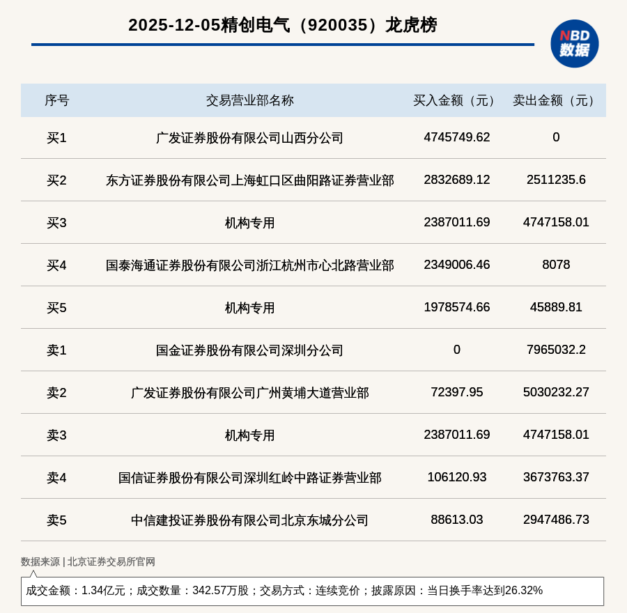 每經(jīng)訊,2025年12月5日,北交所上市公司精創(chuàng)電氣(920035,收盤價(jià):39.2元)登上龍虎榜,交易方式是連續(xù)競(jìng)價(jià),披露原因是當(dāng)日換手率達(dá)到26.32%,成交數(shù)量342.57萬股,成交金額1.34億元。買一席位為廣發(fā)證券股份有限公司山西分公司,買入474.57萬元;賣一席位為國(guó)金證券股份有限公司深圳分公司,賣出796.5萬元。
