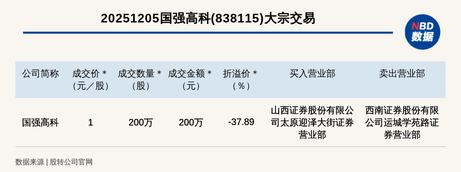 每經(jīng)訊,2025年12月5日,新三板創(chuàng)新層公司國(guó)強(qiáng)高科(838115,收盤價(jià):1.61元)發(fā)生一筆大宗交易,成交價(jià)1元/股,成交數(shù)量200萬(wàn)股,成交金額200萬(wàn)元,折價(jià)37.89%。買入營(yíng)業(yè)部是山西證券股份有限公司太原迎澤大街證券營(yíng)業(yè)部,賣出營(yíng)業(yè)部是西南證券股份有限公司運(yùn)城學(xué)苑路證券營(yíng)業(yè)部。