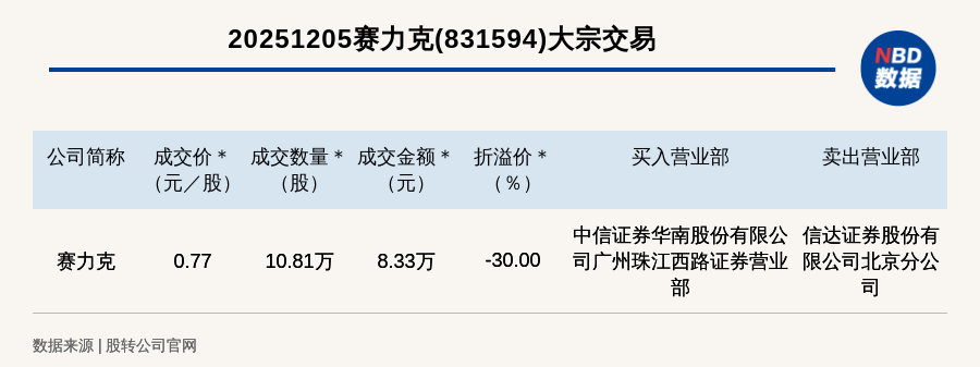 每經(jīng)訊,2025年12月5日,新三板基礎(chǔ)層公司賽力克(831594,收盤價(jià):1.1元)發(fā)生一筆大宗交易,成交價(jià)0.77元/股,成交數(shù)量10.81萬股,成交金額8.33萬元,折價(jià)30%。買入營業(yè)部是中信證券華南股份有限公司廣州珠江西路證券營業(yè)部,賣出營業(yè)部是信達(dá)證券股份有限公司北京分公司。