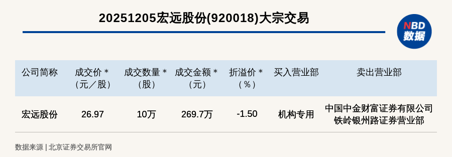 每經(jīng)訊,2025年12月5日,北交所上市公司宏遠股份(920018,收盤價:27.38元)發(fā)生一筆大宗交易,成交價26.97元/股,成交數(shù)量10萬股,成交金額269.7萬元,折價1.5%。買入營業(yè)部是機構(gòu)專用,賣出營業(yè)部是中國中金財富證券有限公司鐵嶺銀州路證券營業(yè)部。