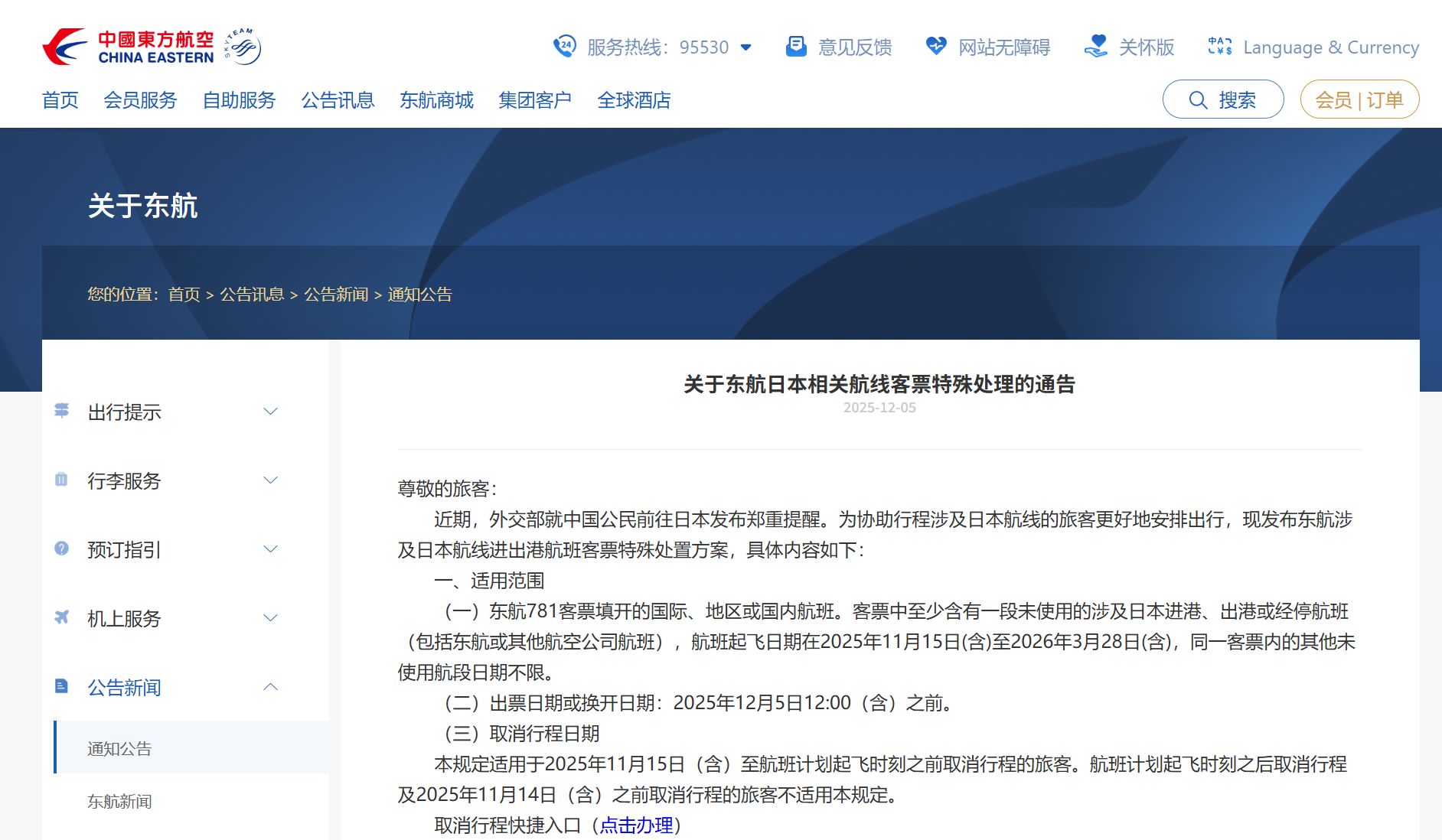 東航發(fā)布公告稱,近期,外交部就中國公民前往日本發(fā)布鄭重提醒。為協(xié)助行程涉及日本航線的旅客更好地安排出行,現(xiàn)發(fā)布東航涉及日本航線進(jìn)出港航班客票特殊處置方案,具體內(nèi)容如下: