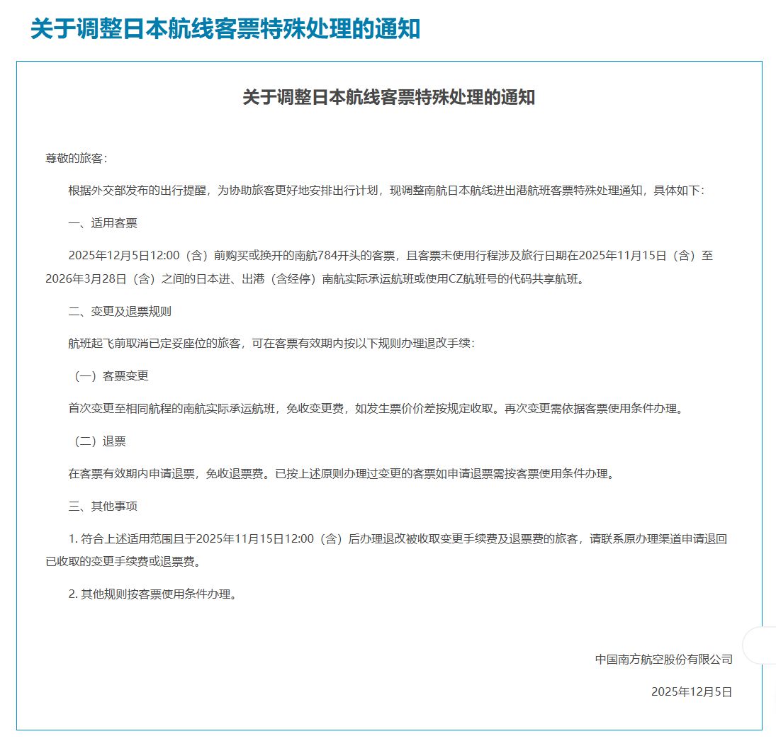 12月5日,國航、東航、南航陸續(xù)發(fā)布日本相關(guān)航線客票特殊處理的通知,2026年3月28日(含)前出行的涉及日本進(jìn)港、出港或經(jīng)停航班可免費(fèi)退改。