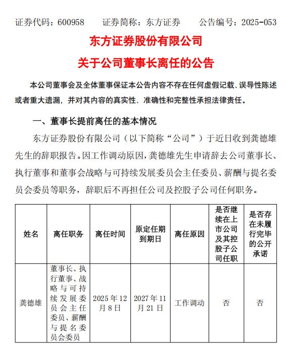 今日收盤后,東方證券發(fā)布公告稱,"于近日收到龔德雄先生的辭職報(bào)告。因工作調(diào)動(dòng)原因,龔德雄先生申請(qǐng)辭去公司董事長、執(zhí)行董事和董事會(huì)戰(zhàn)略與可持續(xù)發(fā)展委員會(huì)主任委員、薪酬與提名委員會(huì)委員等職務(wù),辭職后不再擔(dān)任公司及控股子公司任何職務(wù)。"此次離任距離龔德雄2024 年11月正式就任董事長一年有余,原定任期至2027年11月。