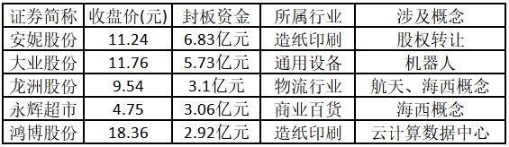 從封板資金來看,今日漲停板個股中,封板資金排名前5的個股包括安妮股份、大業(yè)股份、龍洲股份、永輝超市、鴻博股份。