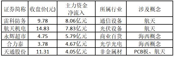 值得注意的是,今日主力資金凈流入金額前兩名的個股均屬于航天板塊,分別為雷科防務(wù)和航天機電。
